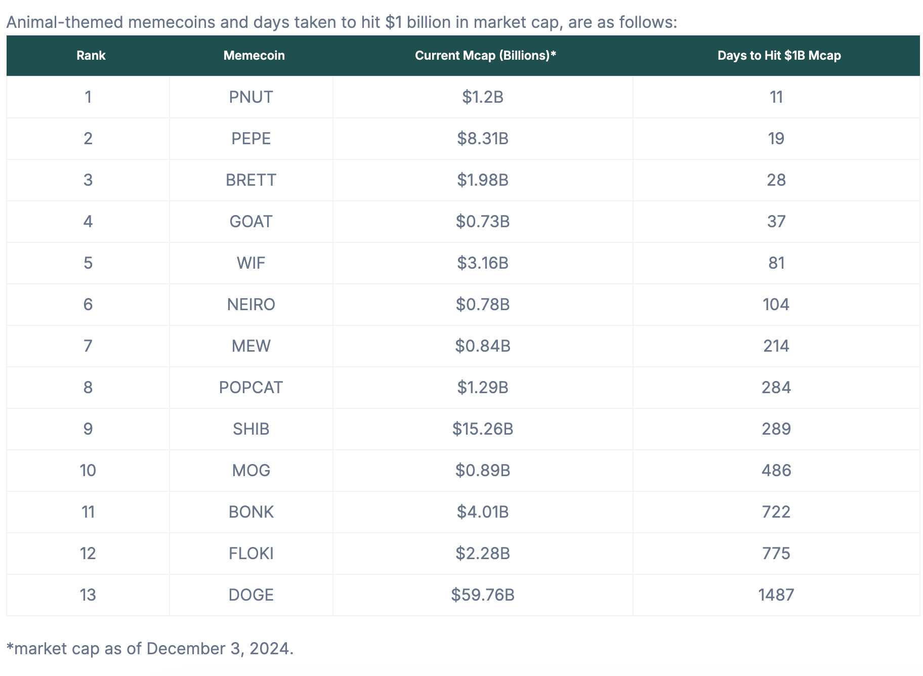 تجاوز هذا الإنجاز "دوجكوين"، التي استغرقت 1487 يوم لتحقيق نفس الإنجاز. يبرز نجاح PNUT استراتيجيات هيمنة عملات الميم، حيث تلعب التوقيت، الانتشار الخاطف، وسرد القصص دورًا رئيسيًا في تحديد القيمة السوقية
