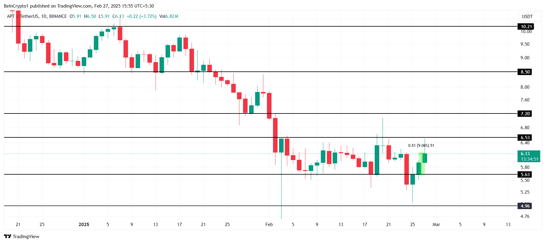 العوامل الإيجابية التي تلعب دورًا تشير إلى أن أبتوس قد تكسر حاجز 6,53$، مما يشير إلى نهاية مرحلة التماسك. من المحتمل أن يمهد هذا الطريق لارتفاع نحو 7,20$، مما يجلب موجة جديدة من التفاؤل وحجم التداول. إذا تمكنت APT من اختراق هذا المستوى، فقد تشعل ارتفاعًا واسع النطاق.