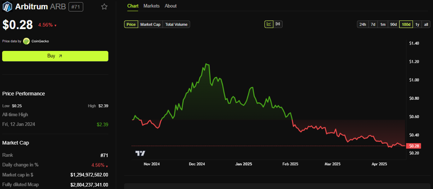 ومع ذلك، على الرغم من التطور القوي للنظام البيئي، فإن ARB، الرمز الأصلي للشبكة، انخفض بنسبة 88% من أعلى مستوى له على الإطلاق.