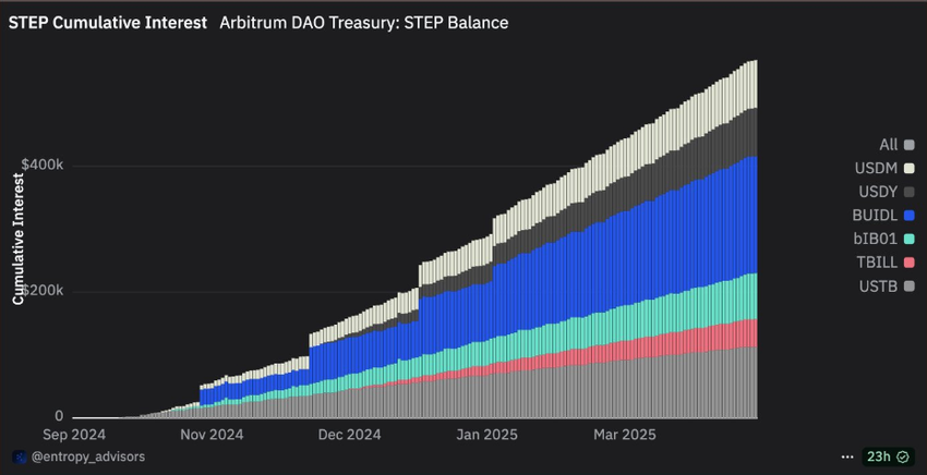 يُعزى هذا التوسع الأسي بشكل كبير إلى برنامج الهبة المستقرة لخزانة أربيتروم DAO (STEP)، الذي هو حاليًا في مرحلته 2,0. البرنامج خصص 85 مليون رمز ARB لدعم RWAs المستقرة والسائلة والمولدة للعائد.