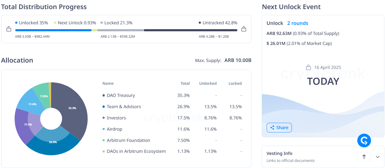 يظهر ضغط هبوطي إضافي، مع فتح 92,63 مليون رمز ARB وشيك. مع وجود 46% فقط من إجمالي العرض حاليًا في التداول، تظل المخاوف بشأن التخفيف ونقص التراكم المباشر للرموز من نمو RWA من العوامل الرئيسية التي تؤثر على السوق.