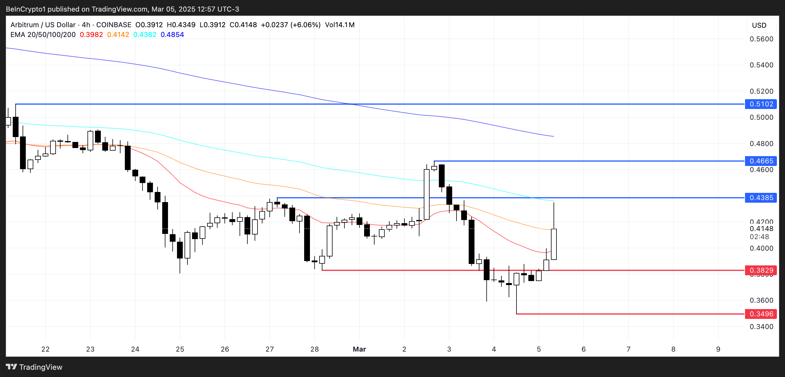 إذا استمر هذا الزخم، فقد يختبر سعر Arbitrum المقاومة عند $٠,٤٣٨. قد يفتح الاختراق فوق هذا المستوى الباب للتحرك نحو $٠,٤٦٦ وحتى $٠,٥١.
