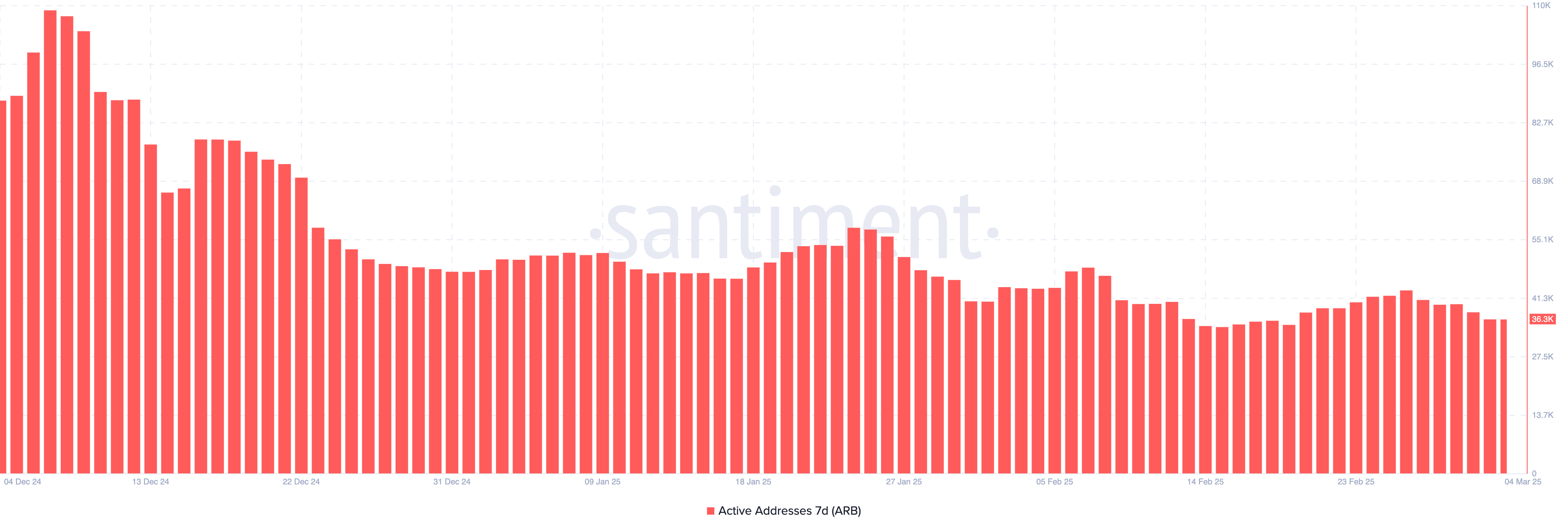 حاليًا، هذا المقياس يقف عند حوالي ٣٦٬٤٠٠، وهو انخفاض حاد من ١١٠٬٠٠٠ عنوان نشط تم تسجيله في ٧ ديسمبر، عندما كان سعر ARB حوالي $١,٢٣.