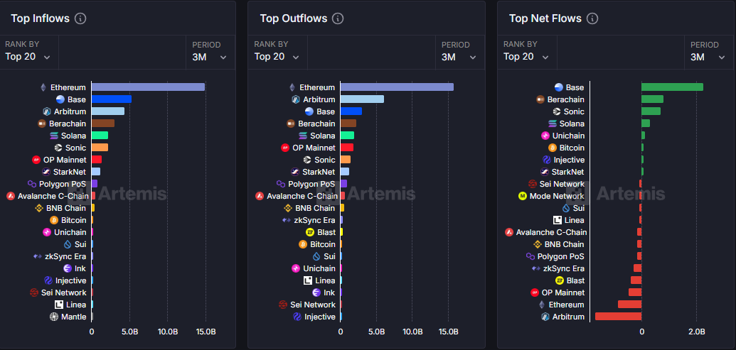 برزت بيس كأداء متميز في عام 2025، متصدرة السوق في التدفق الصافي خلال الأشهر الثلاثة الماضية. في مقاييس التدفق الكلي، تُظهر البيانات على منصة أرتيميس أنها في المرتبة الثانية بعد إيثريوم (ETH). هذا الزخم يعكس تزايد ثقة المستخدمين واعتمادهم عبر مجالات التمويل اللامركزي، الألعاب، وNFT.