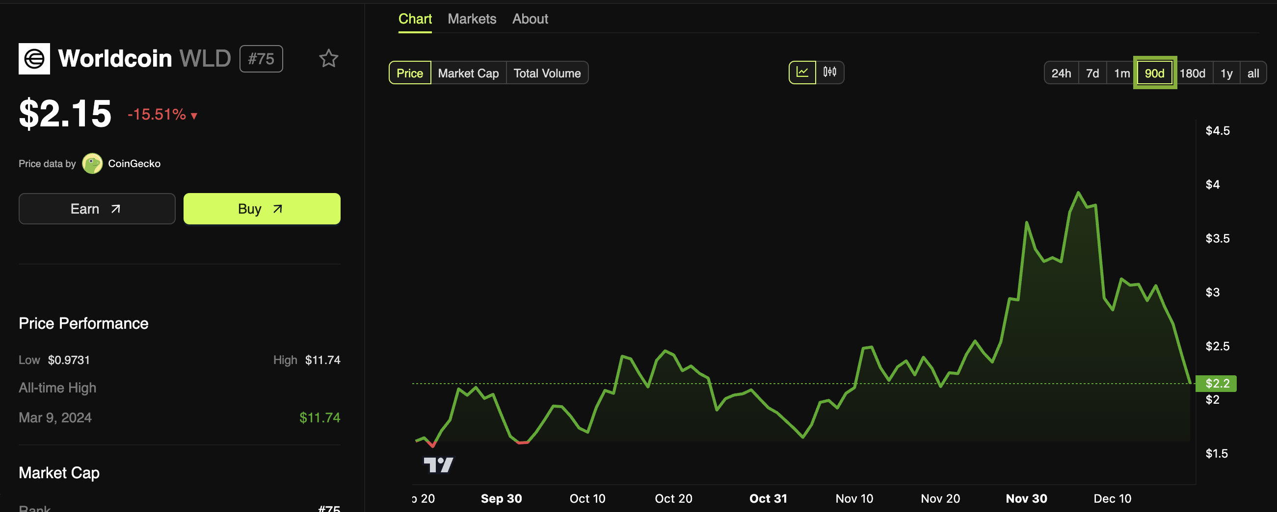 كانت الأشهر القليلة الماضية فترة صعبة لأداء سعر WLD. أعادت الشركة تسمية نفسها من "وورلدكوين" في منتصف أكتوبر، لكن السوق الصاعد العام في نوفمبر وصلها متأخرًا وتراجع بسرعة.