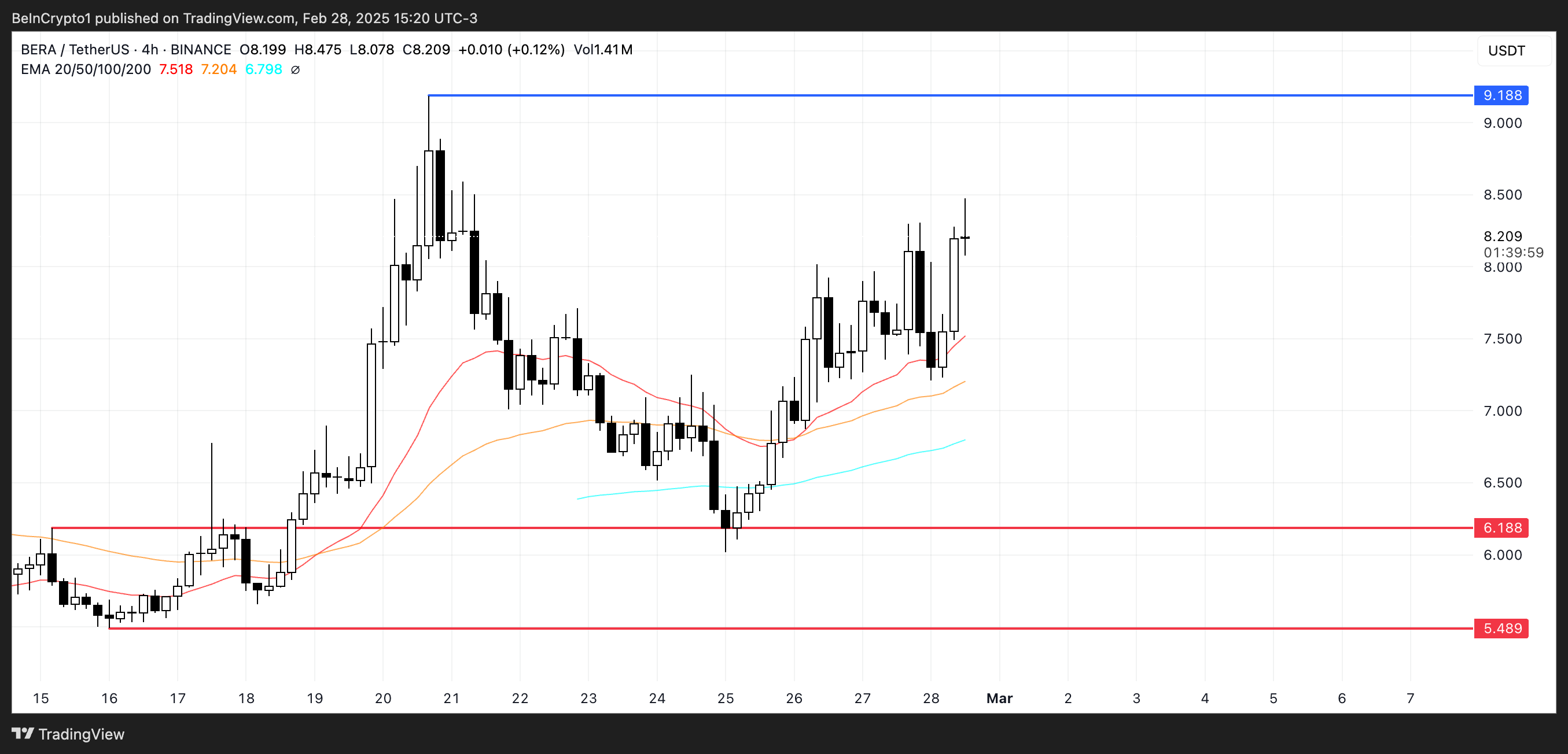قد يكون Berachain (BERA) في طريقه لإعادة اختبار مستويات فوق $٨,٥، وإذا استمر الاتجاه الصعودي الحالي في اكتساب الزخم، فقد يرتفع أكثر لتحدي المقاومة فوق $٩.