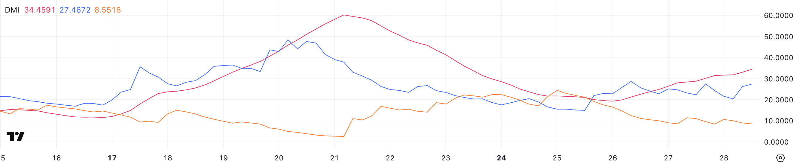 يظهر DMI لبيراشين أن ADX حاليًا عند 34,4، مرتفعًا من 19,3 قبل يومين، بعد أن وصل سابقًا إلى 60,2 قبل أسبوع عندما تجاوز سعر BERA 8,5 دولار. يقيس مؤشر الاتجاه المتوسط (ADX) قوة الاتجاه دون الإشارة إلى اتجاهه، ويتراوح من 0 إلى 100.
