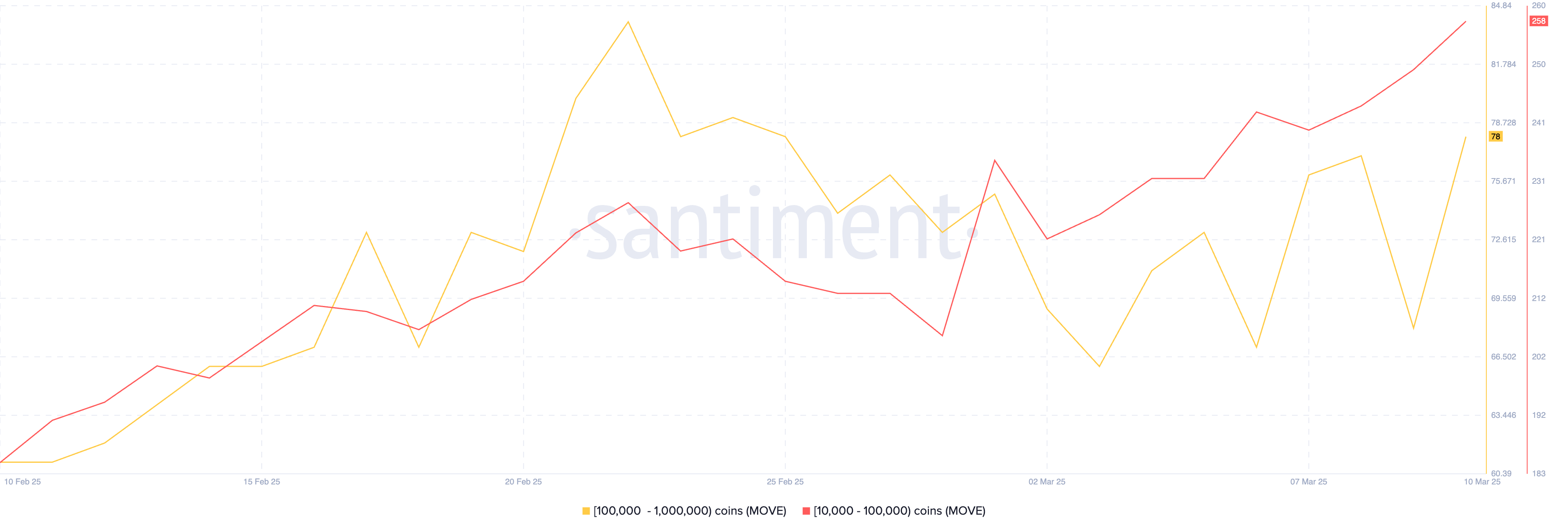 عدد المحافظ التي تحتوي بين 10,000 و1,000,000 MOVE زاد من 291 في 2 مارس إلى 336، مما يشير إلى أن حيتان العملات الرقمية كانت تجمع بنشاط.