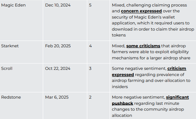 علاوة على ذلك، يشير التقرير إلى زراعة Sybil، حيث تجمع البوتات الرموز بكميات كبيرة. فشلت فنية مثل عملية المطالبة الفاشلة لـ Magic Eden في ديسمبر ٢٠٢٤ زادت من استياء المستخدمين.