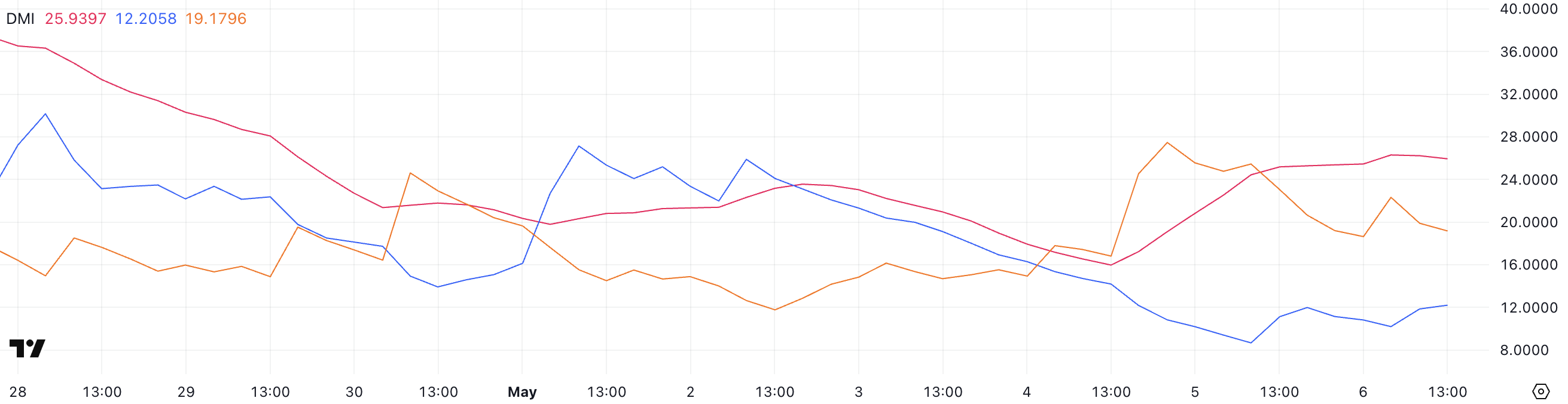 ارتفع ADX، الذي يقيس قوة الاتجاه بغض النظر عن الاتجاه، بشكل حاد إلى ٢٥,٩٣، مرتفعًا من ١٥,٩٧ قبل يومين فقط—متجاوزًا العتبة الرئيسية ٢٥ التي تشير إلى أن الاتجاه بدأ يكتسب زخمًا.