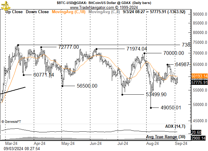 سعر البيتكوين (BTC) حاليًا عند 56 500$ بعد تشكيل قيعان أدنى على الإطار الزمني الكبير وعدم تشكيل قمة جديدة على الرغم من الانقسام.