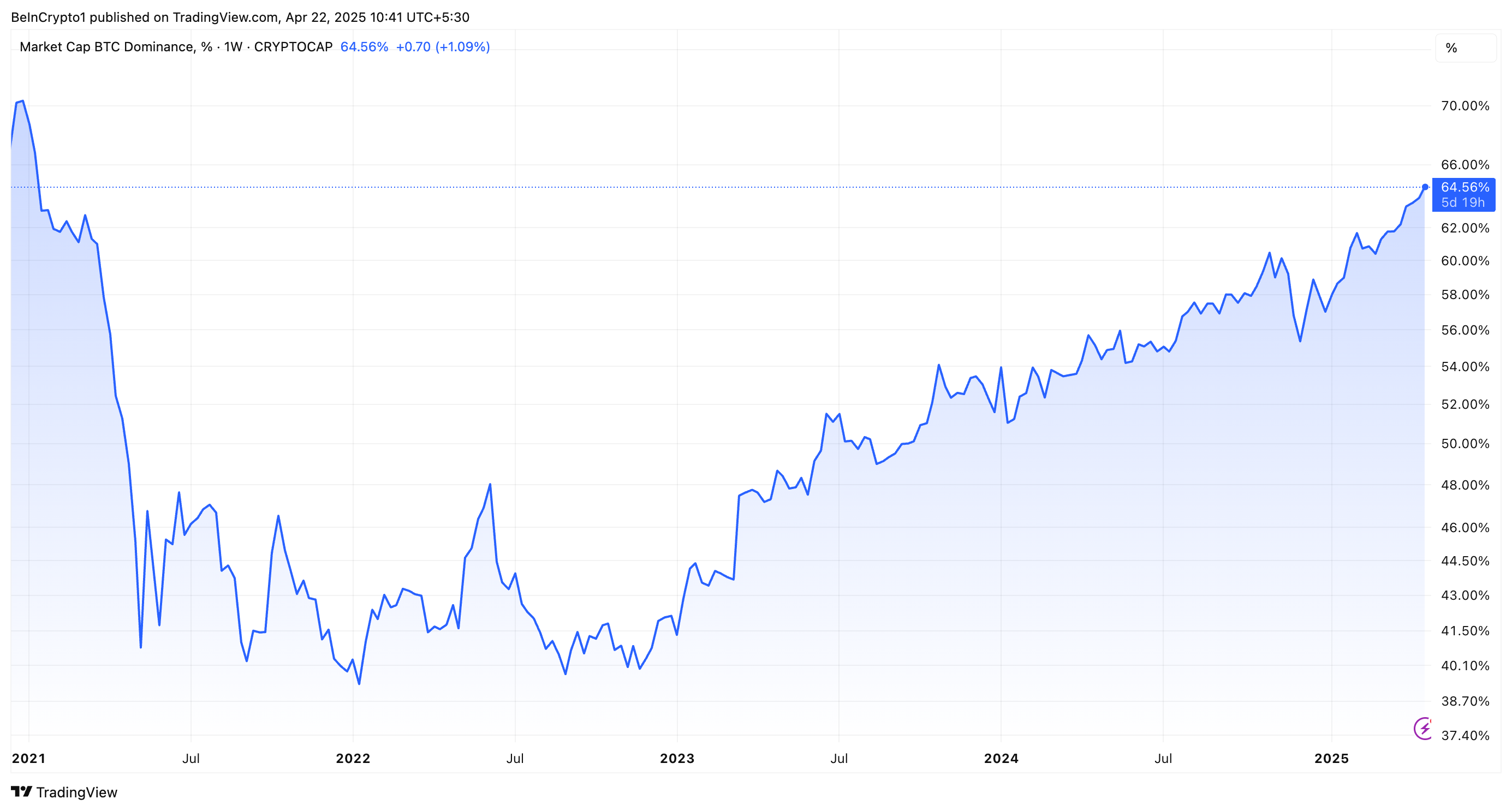 أفاد موقع BeInCrypto الأسبوع الماضي أن هيمنة بيتكوين وصلت إلى أعلى مستوى لها في أكثر من أربع سنوات. وفقًا لأحدث البيانات، بلغت BTC.D ٦٤,٥%، بزيادة ١١% منذ بداية العام.