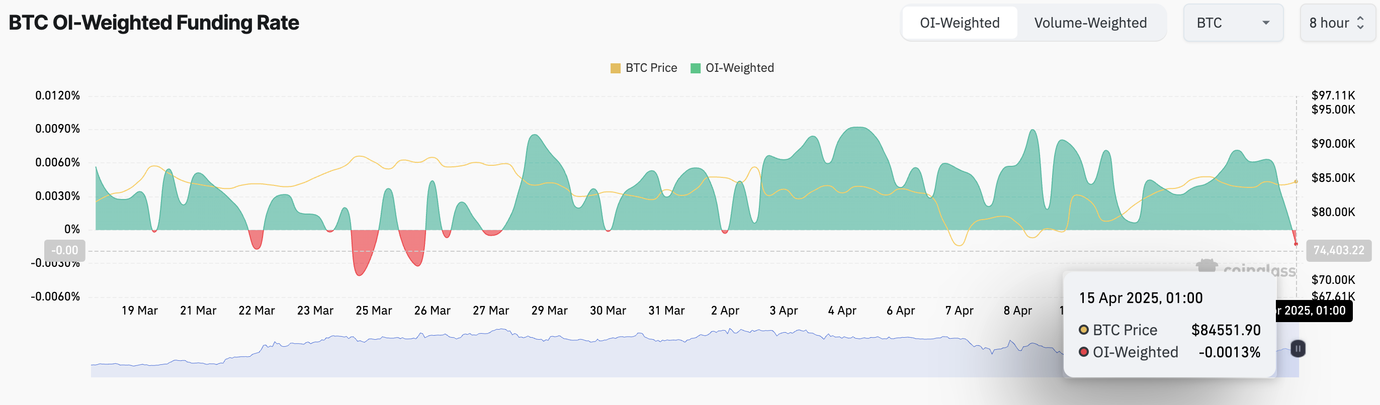 ومع ذلك، هناك مشكلة. بينما زادت الفائدة المفتوحة في عقود بيتكوين الآجلة، يبدو أن طبيعة هذه المراكز الجديدة هبوطية. يتضح ذلك في معدل تمويل العملة، الذي انقلب الآن إلى السالب لأول مرة منذ 2 أبريل.