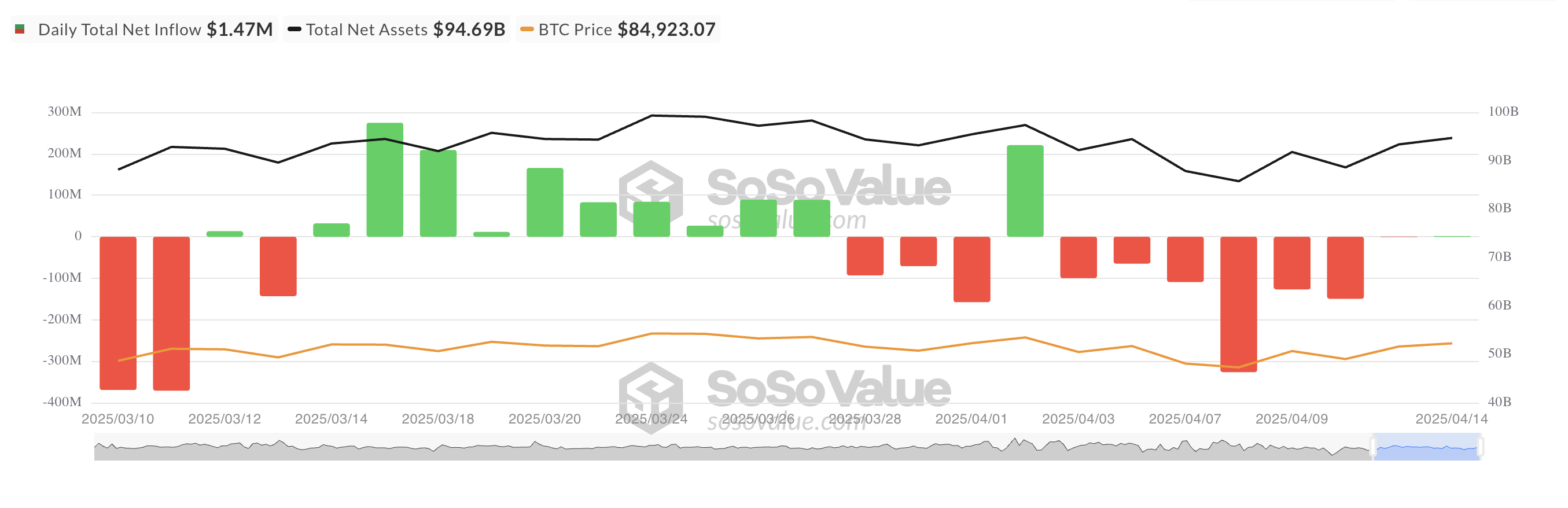 يوم الاثنين، سجلت صناديق بيتكوين المتداولة في البورصة المدرجة في الولايات المتحدة تدفقات صافية بقيمة 1,47 مليون دولار، مما يمثل أول تدفق رأسمالي إلى هذه الصناديق منذ 2 أبريل. بينما يعتبر المبلغ متواضعًا، إلا أنه يكسر جفافًا استمر قرابة أسبوعين وقد يشير إلى تحول تدريجي في شعور المؤسسات تجاه BTC.