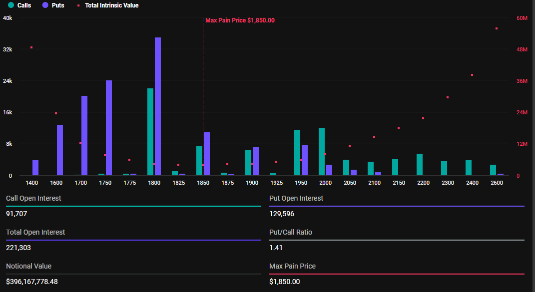من هذا المجموع، تمثل خيارات بيتكوين (BTC) 2,18 مليار دولار، بينما تمثل خيارات إيثريوم (ETH) 396,16 مليون دولار.