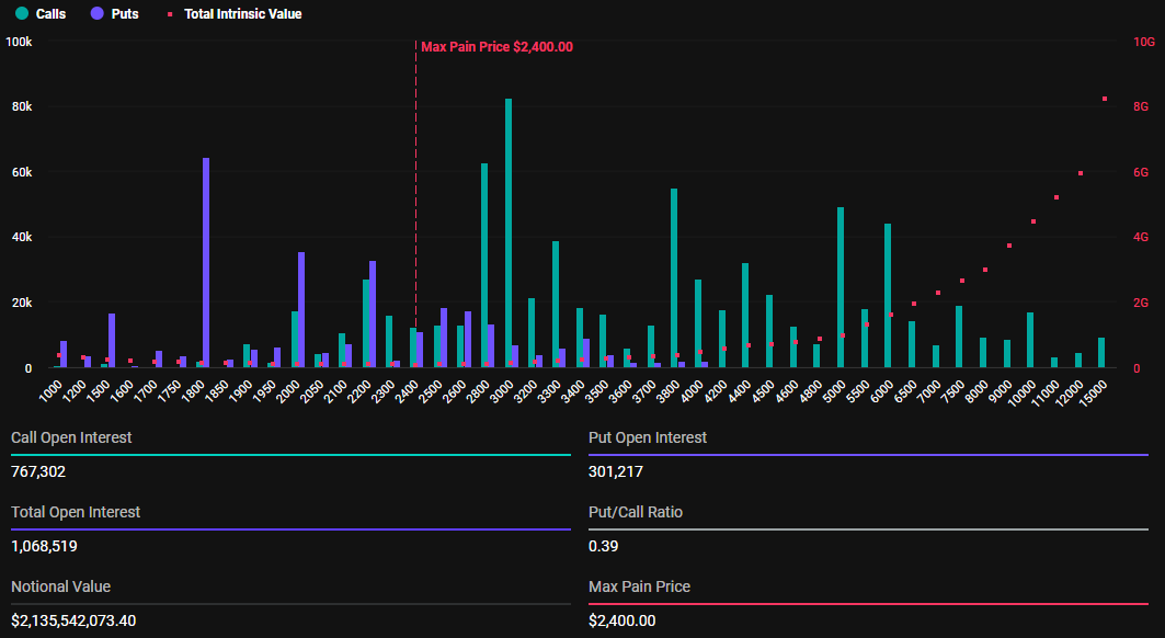 بالإضافة إلى خيارات بيتكوين، من المقرر أن تنتهي صلاحية ١,٠٦٨,٥١٩ عقد خيارات إيثريوم اليوم. هذه الخيارات المنتهية لديها قيمة اسمية تبلغ ٢,١٣٥ مليار دولار، ونسبة وضع إلى نداء تبلغ ٠,٣٩، ونقطة ألم قصوى تبلغ ٢,٤٠٠ دولار.