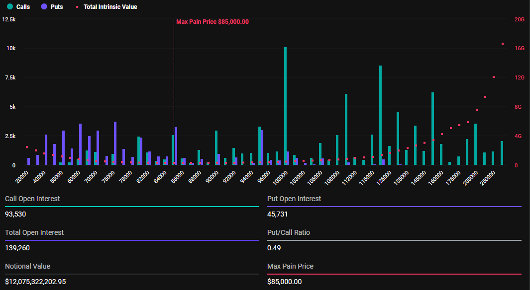 تكشف البيانات أيضًا أن نقطة الألم القصوى لهذه الخيارات المنتهية هي ٨٥,٠٠٠ دولار. نقطة الألم القصوى هي السعر الذي سيسبب أكبر عدد من الخسائر المالية لحاملي الأصول.