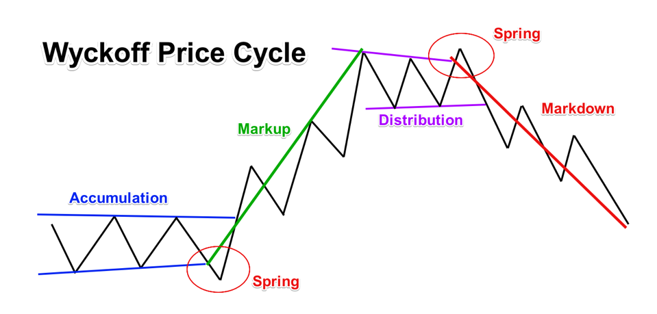 - التوزيع: حيث تبيع الأموال الذكية عند الارتفاعات، ويتميز أيضًا بـ "الربيع" (اختراق زائف)