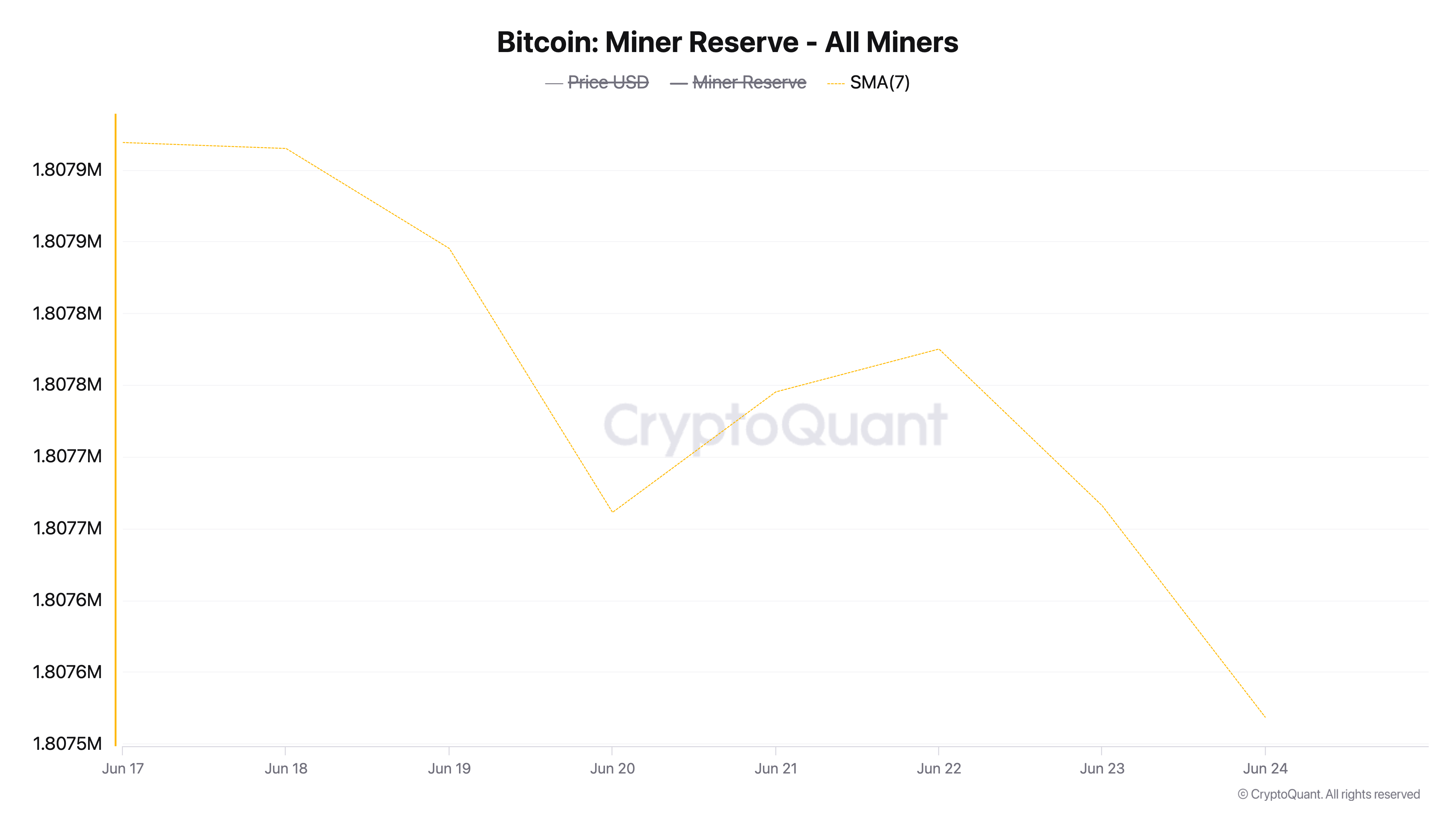 وفقًا لبيانات CryptoQuant، انخفض احتياطي المعدنين لـ BTC تدريجيًا خلال الأسبوع الماضي. وقد انخفض بنسبة 0,022% على متوسط متحرك لمدة سبعة أيام.