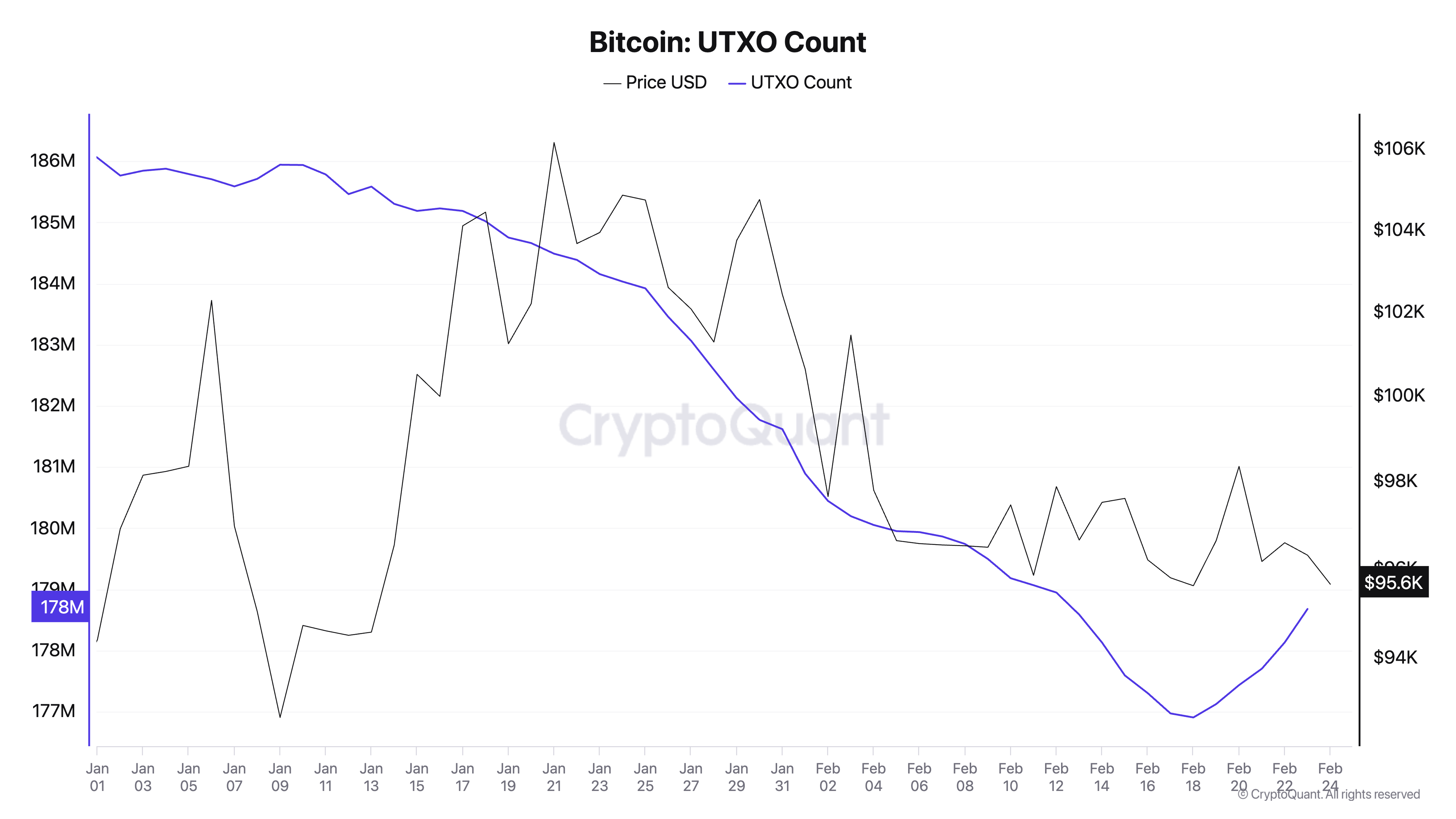 يتتبع مخرج المعاملة غير المنفقة (UTXO) كمية بيتكوين المتبقية بعد معاملة، والتي يمكن استخدامها كمدخلات للمعاملات المستقبلية. يمثل الرصيد المتاح الذي يمكن إنفاقه على الشبكة. عندما ينخفض عدد UTXOs، يتم توزيع أو نقل عدد أقل من العملات الجديدة، مما يشير إلى انخفاض نشاط المعاملات. يشير هذا إلى فترة من التماسك، حيث يحتفظ المستثمرون بعملاتهم بدلاً من إنفاقها.
