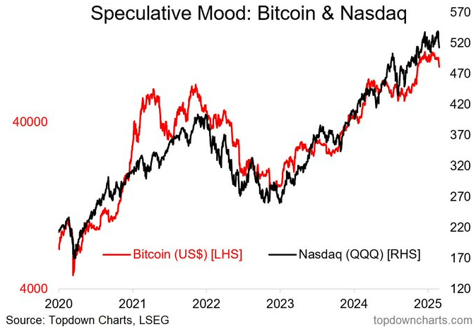 أحد العوامل الرئيسية في هذا التغيير هو الارتباط المتزايد لبيتكوين مع الأصول المالية التقليدية. في عام 2024، تحرك BTC بالتزامن مع ناسداك 100 وS&P 500 حوالي 88% من الوقت، وهو تباين حاد عن دوره السابق كأصل ذو ارتباط سلبي.