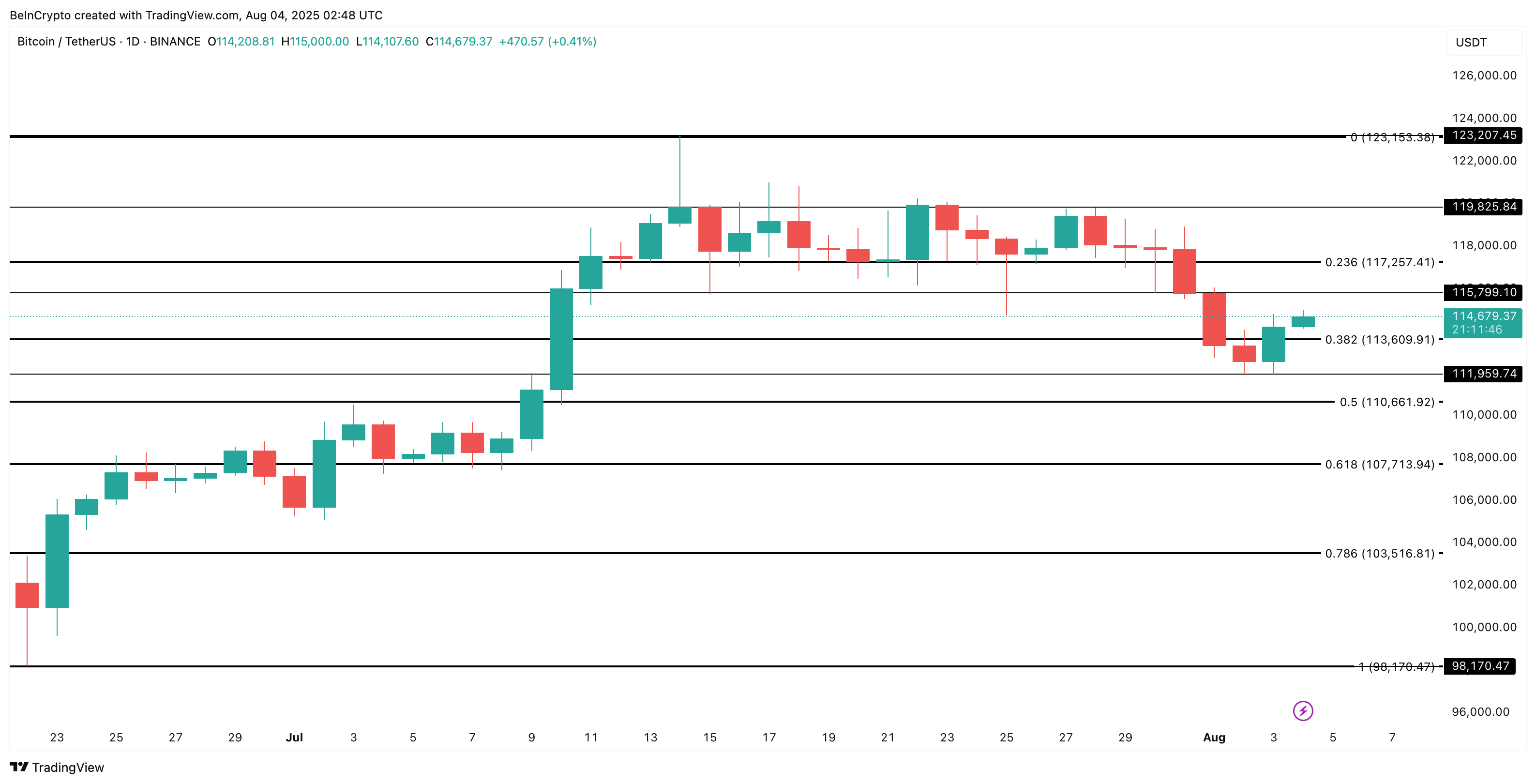 على الرسم البياني، يحتفظ سعر بيتكوين بمستوى فوق مستوى تصحيح فيبوناتشي 0,382 عند 113,600 دولار. تم رسم هذا المستوى من أدنى مستوى في يونيو عند 98,000 دولار إلى أعلى مستوى على الإطلاق عند 123,000 دولار.