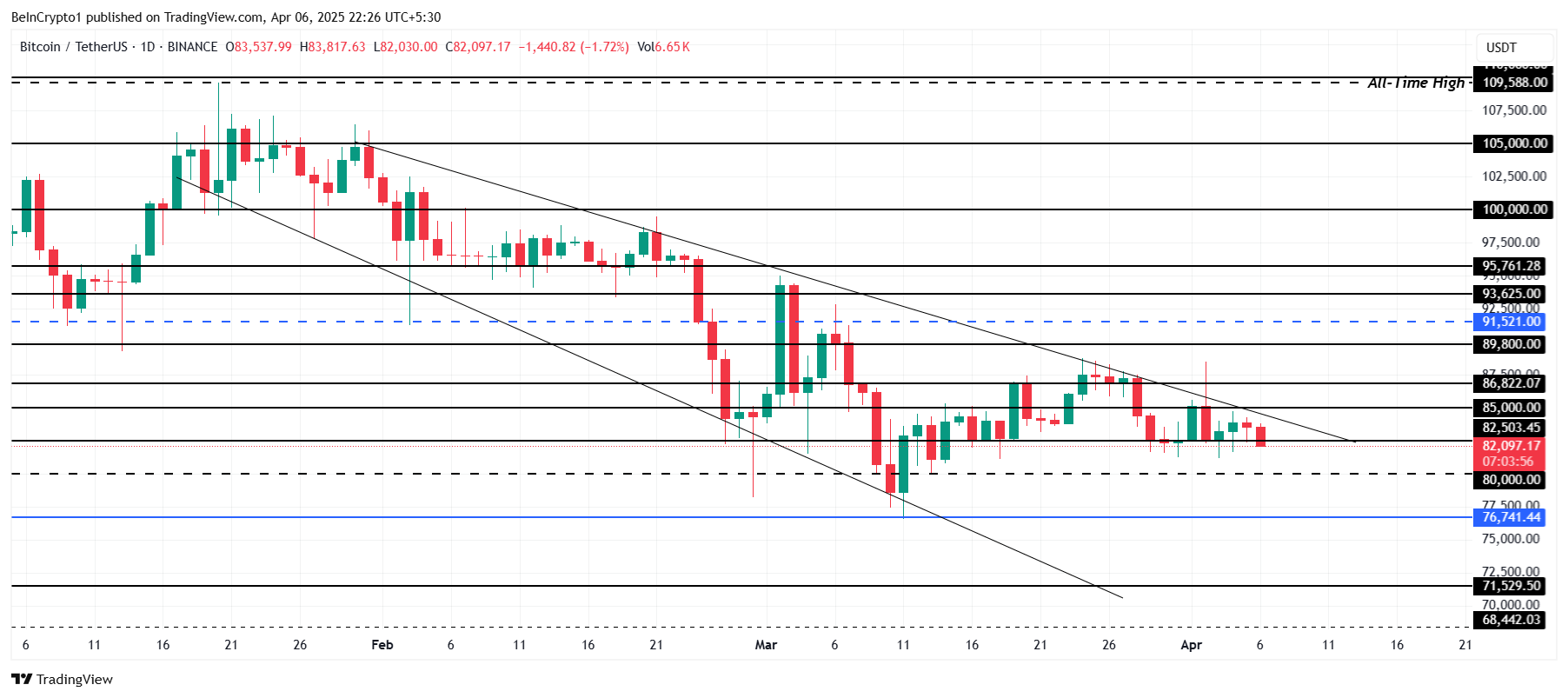 يتم تداول بيتكوين عند ٨٢٬٠٩٧ دولارًا، محاولًا البقاء فوق العلامة الحرجة ٨٢٬٥٠٣ دولارًا. هذا المستوى ضروري لـ BTC لجمع القوة ومحاولة الخروج من الإسفين الهابط. يمكن أن يشعل الإغلاق اليومي فوقه اتجاهًا صعوديًا قصير الأجل.