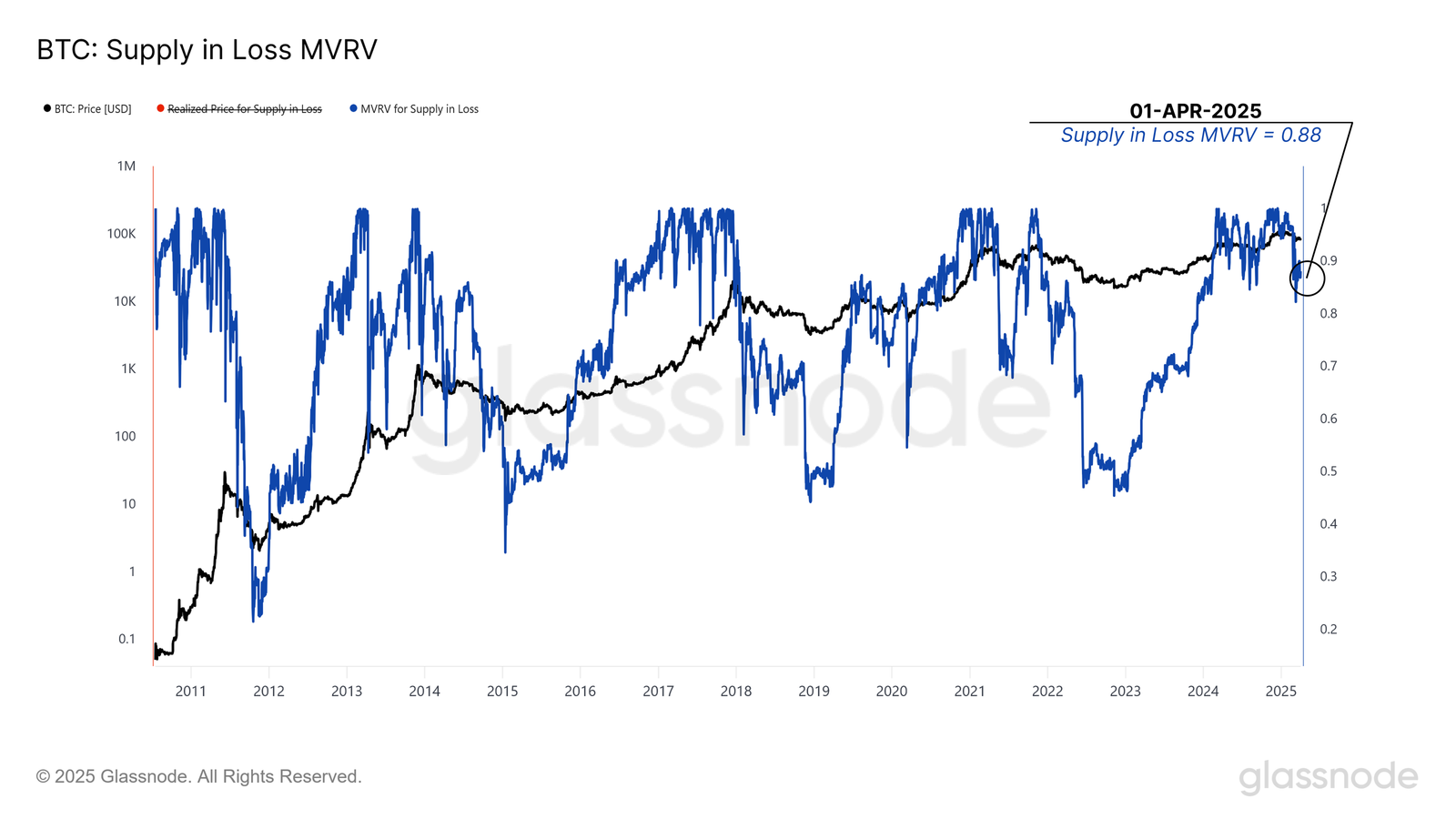 انخفضت القيمة السوقية لبيتكوين إلى القيمة المحققة، أو العرض MVRV، إلى ٠,٨٨ هذا الأسبوع. يبرز هذا المقياس مدى الخسارة المحققة من قبل المستثمر المتوسط في BTC. بينما يشير هذا المستوى إلى خسائر، إلا أنه ليس شديدًا مثل التصحيحات الكبرى السابقة، مثل تلك في ٢٠١٨ أو ٢٠٢٢. وهذا يشير إلى أن الاتجاه الهبوطي الحالي معتدل نسبيًا مقارنة بمراحل الدب التاريخية.