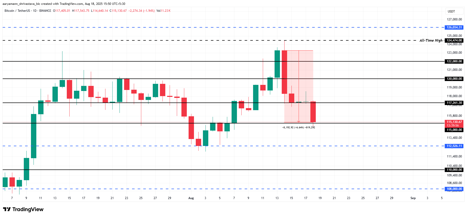 سعر بيتكوين يحوم حاليًا حول ١١٥٬١٣٠ دولارًا، بالكاد يحافظ على الدعم عند ١١٥٬٠٠٠ دولار. الانخفاض بنسبة ٦% خلال الأيام القليلة الماضية، الذي تسببت فيه عمليات بيع الحيتان وتحركات LTH، يشير إلى أن BTC قد تستمر في الانخفاض على المدى القصير.
