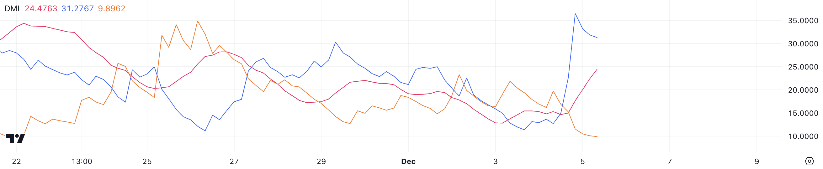 يظهر مخطط DMI لـ بيتكوين ارتفاع ADX إلى 24,4 من 15 في يوم واحد فقط، مما يشير إلى تعزيز الاتجاه. هذا الارتفاع يشير إلى أن BTC تنتقل من حالة سوق أضعف إلى اتجاه أكثر تحديدًا.