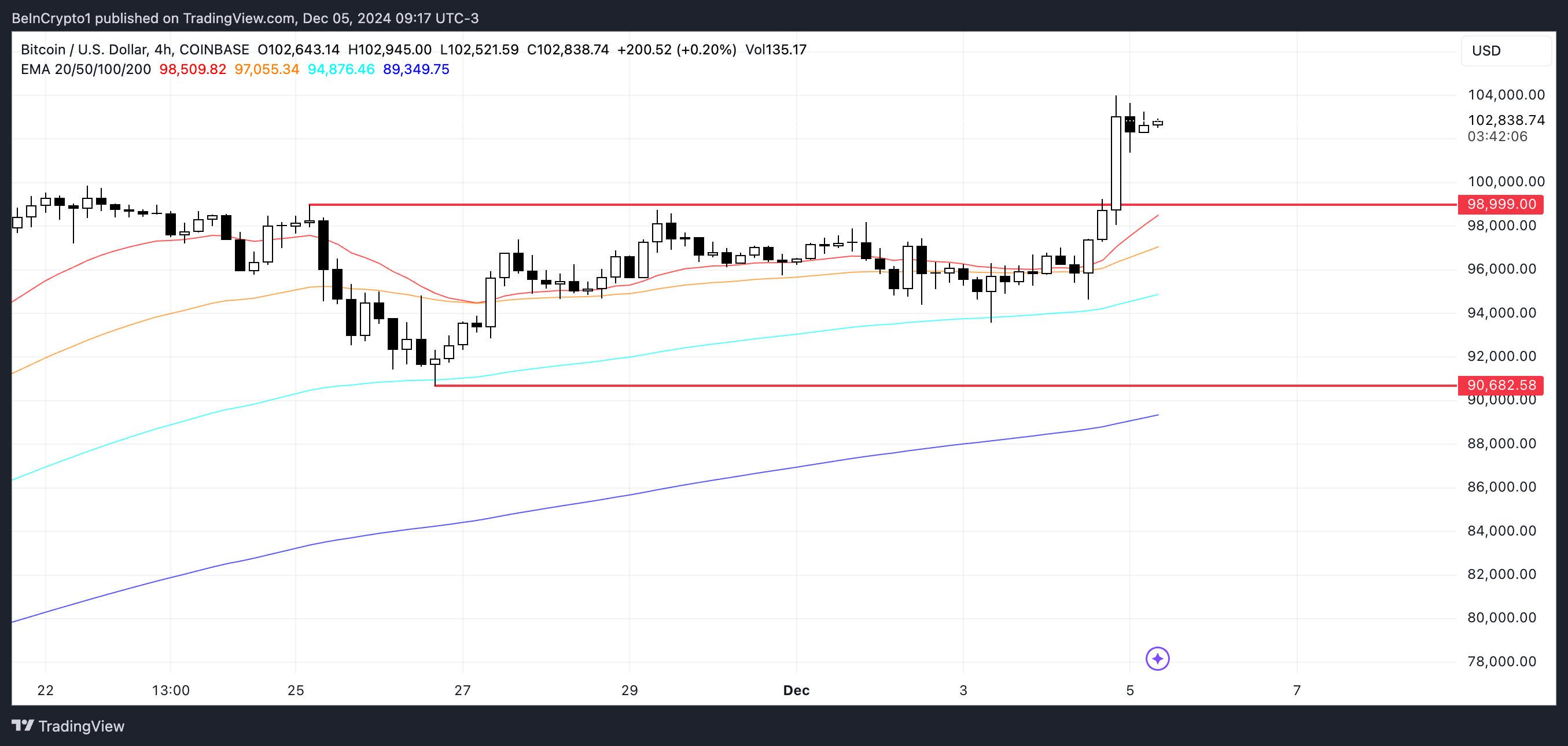 يظهر مخطط سعر بيتكوين أن خطوط EMA في تكوين صعودي قوي، مع وجود الخطوط قصيرة الأجل فوق الخطوط طويلة الأجل وتداول السعر فوق جميعها.