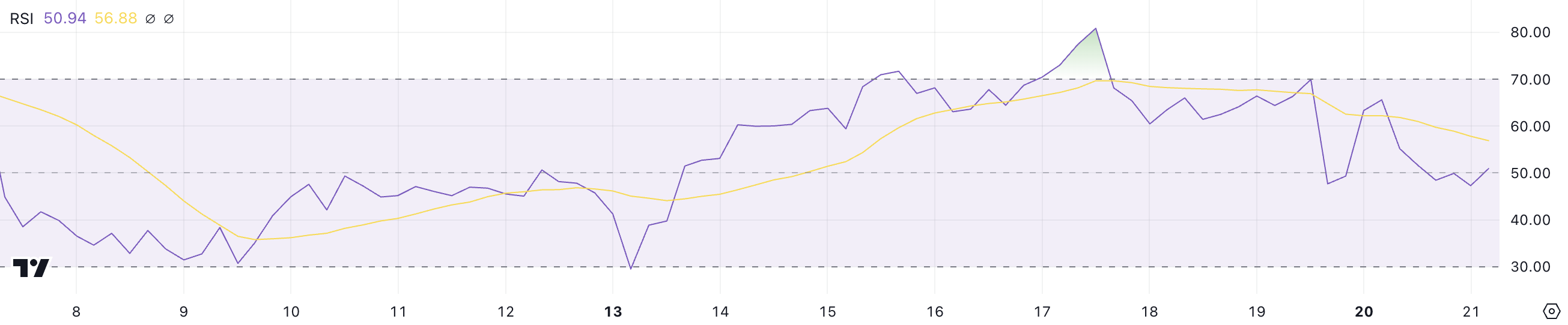 Sponsoredفي المقابل، تشير القيم تحت 30 إلى مستويات بيع مفرطة وارتدادات محتملة. قراءة حول 50 تشير إلى زخم محايد، مما يشير إلى أن لا المشترين ولا البائعين في سيطرة واضحة.