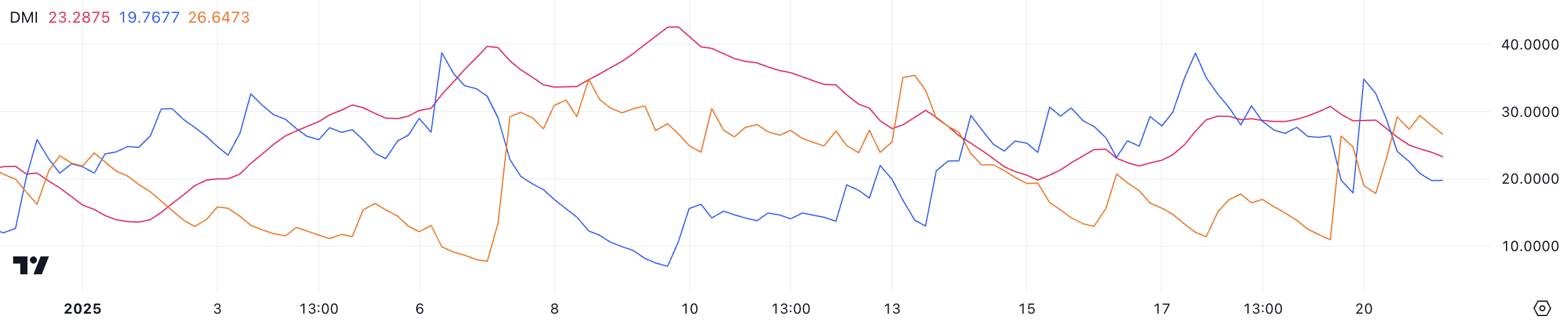 يكشف مخطط DMI لـ بيتكوين أن ADX انخفض إلى 23,2 من 30,7 خلال اليومين الماضيين، مما يبرز ضعف الاتجاه. يقيس ADX قوة الاتجاه، مع القيم فوق 25 تشير إلى اتجاه قوي وتلك تحت 20 تشير إلى نقص في الاتجاه.