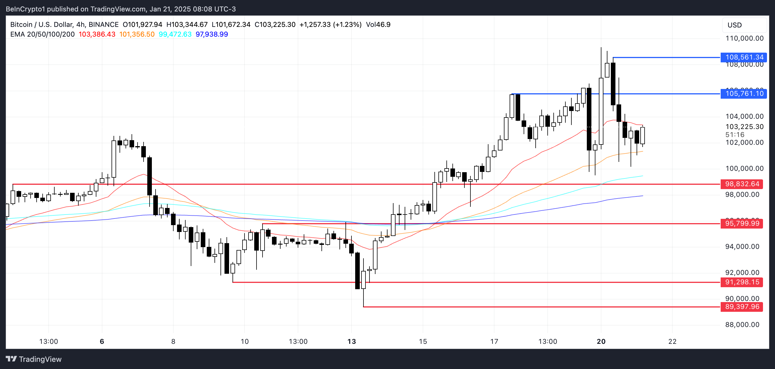 سعر بيتكوين (BTC) ارتفع بأكثر من 8% في الأيام السبعة الماضية، مع تسجيل أعلى مستوى جديد على الإطلاق في 20 يناير، عندما تجاوز لأول مرة 108,000. هذا الارتفاع الملحوظ أثار التكهنات حول ما إذا كان الاتجاه الصعودي لـ BTC سيستمر في اختبار مستويات مقاومة جديدة أو يواجه تراجعًا محتملاً.