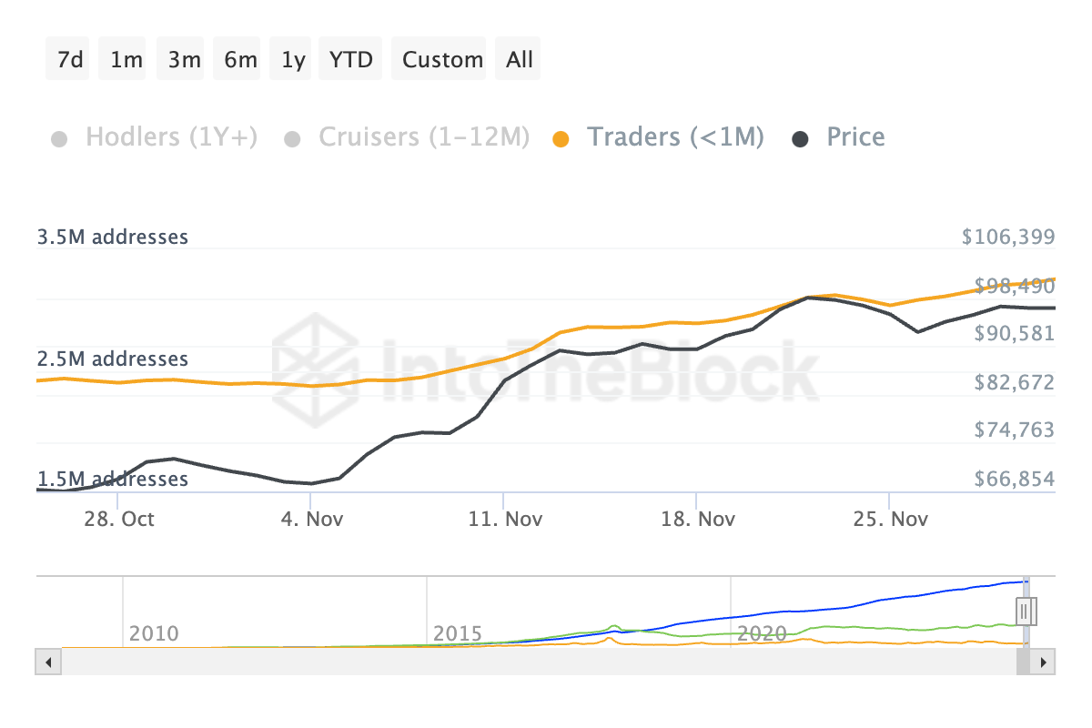 علاوة على ذلك، يمكن أن يؤدي الاتجاه المتزايد لحاملي بيتكوين على المدى القصير الذين يتبنون استراتيجية "HODL" إلى تعزيز ارتفاع نحو حاجز الـ١٠٠٬٠٠٠ دولار. وفقاً لـCryptoQuant، هذه المجموعة — عادةً أولئك الذين يحتفظون بـBTC لأقل من شهر — قد مددت فترة احتفاظها بنسبة ٣٦٪ خلال الشهر الماضي.