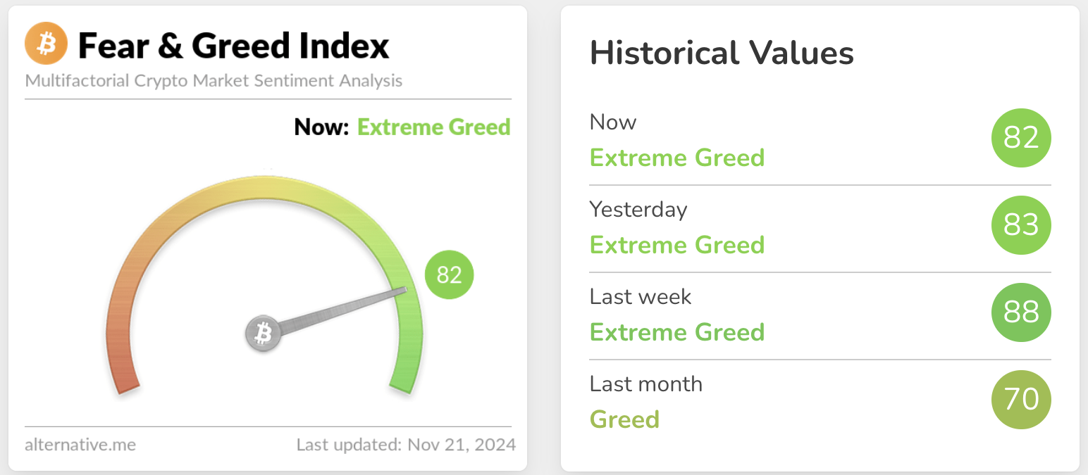 في الوقت نفسه، عزز الحيتان والمحتفظون على المدى الطويل زخم بيتكوين المستمر في المرحلة الأخيرة. نظرة واحدة على مؤشر الخوف والجشع للعملات الرقمية تظهر أن الغالبية العظمى من المستخدمين يتوقعون مكاسب إضافية من هنا.