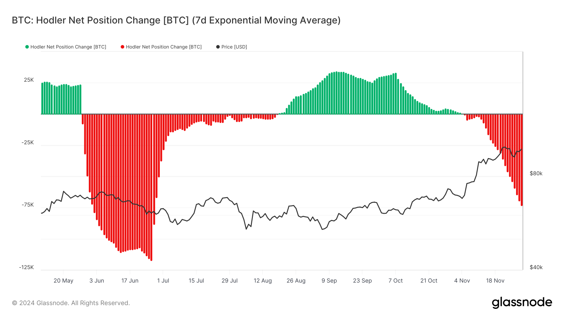 أظهر الحاملون على المدى الطويل لبيتكوين مؤخرًا علامات على الشعور الهبوطي. مؤشر تغيير صافي موقف HODLer، الذي يتتبع سلوك LTHs، قد تحول إلى السلبية.