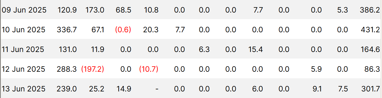 على الصعيد الاقتصادي الكلي، لعبت صناديق الاستثمار المتداولة في بيتكوين دورًا كبيرًا في التطورات الأخيرة في السوق. يوم الجمعة الماضي، شهدت صناديق الاستثمار المتداولة في بيتكوين تدفقات داخلية بقيمة 301,7 مليون دولار بعد الصراع بين إسرائيل وإيران. كان هذا ثاني أعلى تدفق داخلي في الأسبوع، حيث سجل كل يوم تدفقات داخلية متسقة. حقيقة أن المستثمرين المؤسسيين لم يتأثروا بالتوترات الجيوسياسية تشير إلى نظرة متفائلة من هذا الجزء من السوق.