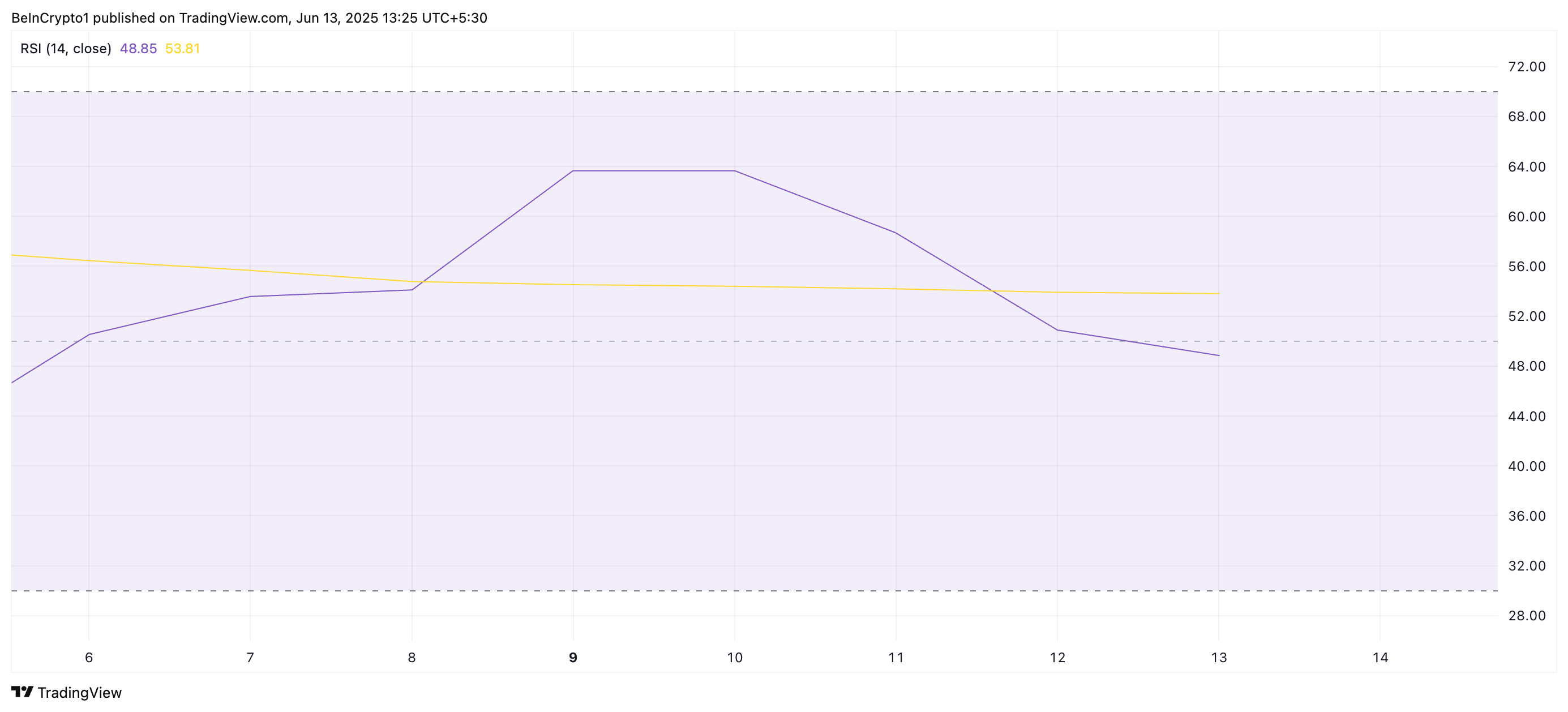 يقيس مؤشر RSI ظروف السوق المبالغ في شرائها والمبالغ في بيعها لأصل ما. يتراوح بين 0 و100، مع قيم فوق 70 تشير إلى أن الأصل مبالغ في شرائه وقد يتعرض لانخفاض في السعر. على العكس، القيم تحت 30 تشير إلى أن الأصل مبالغ في بيعه وقد يشهد انتعاشًا.