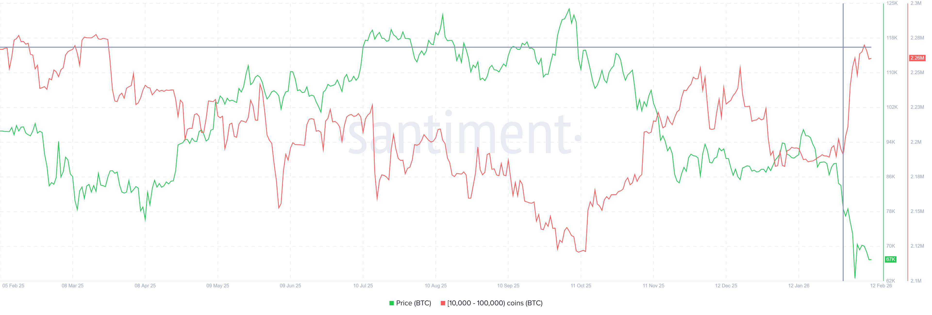 بينما يبيع المستثمرون الصغار، يقوم حيتان بيتكوين بإعادة تدوير رؤوس الأموال مجددًا في btc. تراكمت العناوين التي تحتفظ بين 10 000 و100 000 btc أكثر من 70 000 btc منذ بداية الشهر. يعادل هذا التراكم تقريبًا 4,6 مليار$ بالأسعار الحالية.