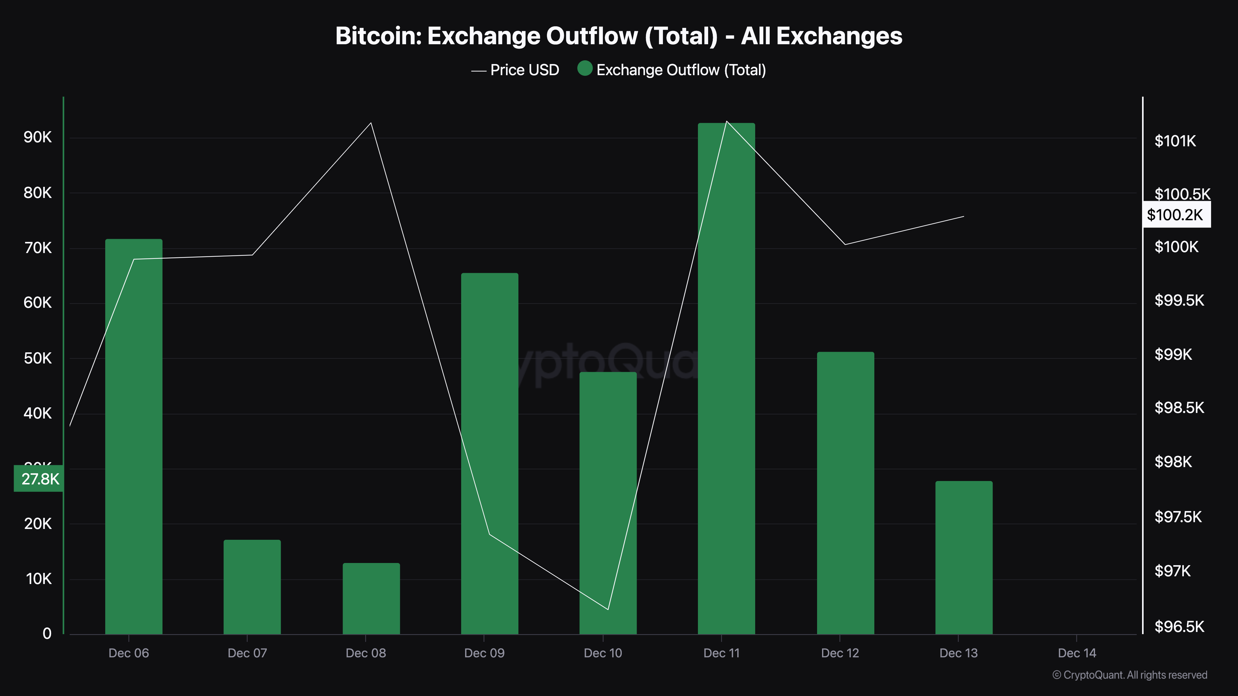 ومع ذلك، يشير الانخفاض إلى أن معدل HODLing قد انخفض، مما قد يؤثر سلبًا على السعر. وفقًا لـ CryptoQuant، انخفض التدفق الخارجي لبيتكوين من البورصات من الذروة التي وصل إليها في ١١ ديسمبر. إذا استمر هذا الانخفاض، فإن سعر بيتكوين قد يكون على وشك الانزلاق مرة أخرى إلى ما دون ١٠٠,٠٠٠ دولار.