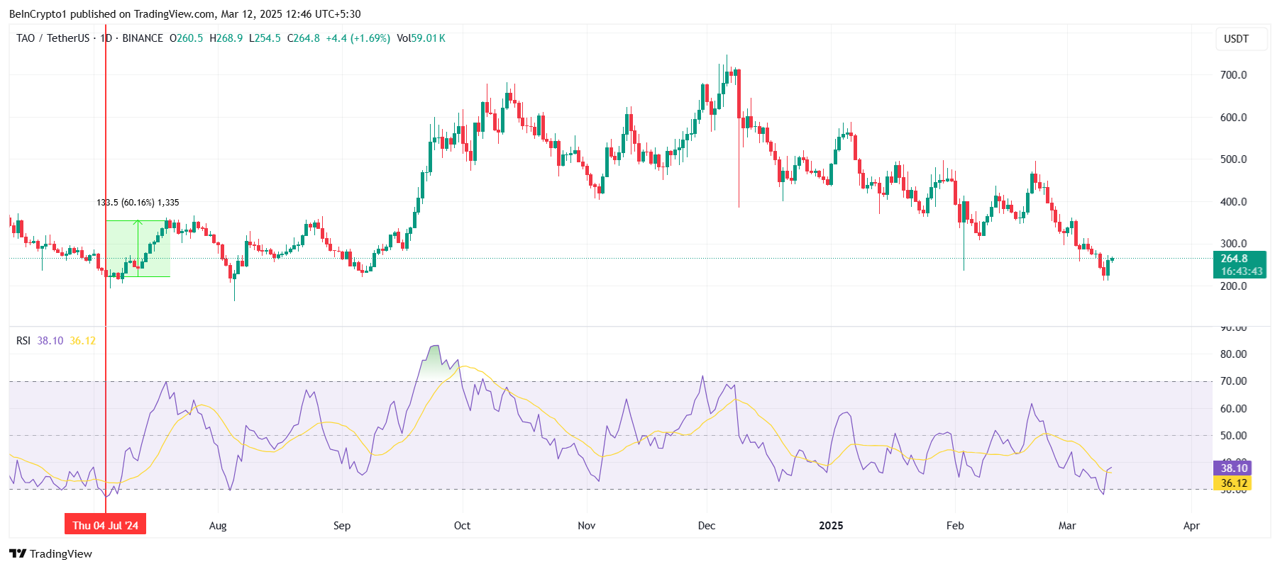 مؤخراً، شهدت TAO انخفاضاً كبيراً بنسبة 45٪ خلال أسبوعين، ويرجع ذلك أساساً إلى فشلها في الخروج من نمط الوتد الهابط. ومع ذلك، يتم تداول TAO الآن عند 264 دولاراً، بعد أن ارتدت عن خط الاتجاه السفلي لهذا النمط. لا تزال العملة البديلة عالقة تحت علامة 300 دولار، ولكن يبدو أنها مستعدة لاختراق هذه المقاومة في المستقبل القريب.