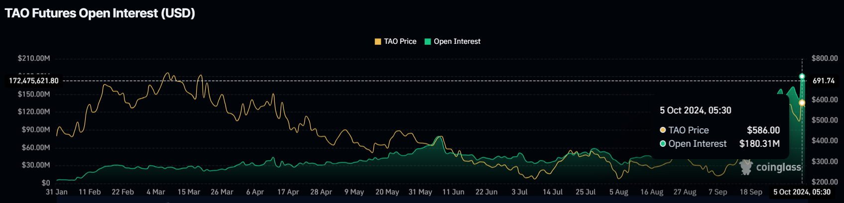 المشاعر السوقية حول بيتنسور إيجابية للغاية، كما يتضح من الارتفاع في الفائدة المفتوحة خلال الـ 24 ساعة الماضية. الفائدة المفتوحة، التي تقيس القيمة المجمعة لجميع العقود المفتوحة في سوق العقود الآجلة، بلغت ذروتها على الإطلاق بـ 180 مليون دولار. هذا التدفق لتدفقات المتداولين يشير إلى ثقة قوية في إمكانيات سعر TAO مع قيام المزيد من المشاركين في السوق بالمراهنة على استمرار الارتفاع.