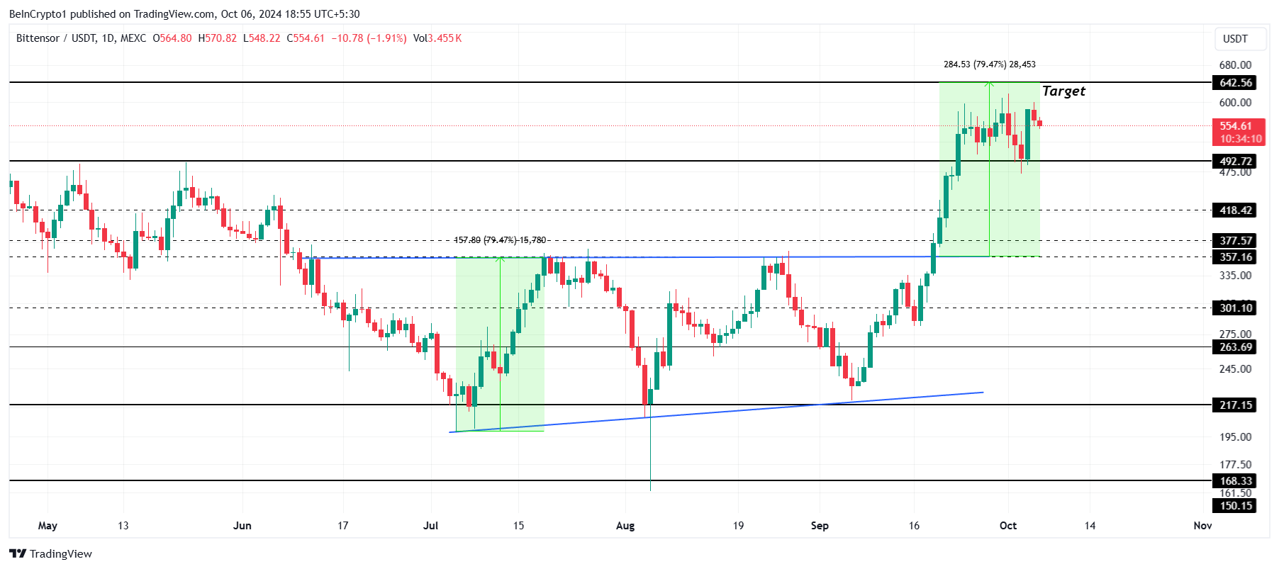 يتداول TAO حاليًا بسعر 554$، ويقترب من الهدف البالغ 642$ الذي حدده نمط المثلث الصاعد الذي تشكل خلال الأربعة أشهر الماضية. يشير هذا النمط إلى ارتفاع محتمل في السعر بنسبة 79% عند الاختراق؛ هدف يقترب منه TAO.