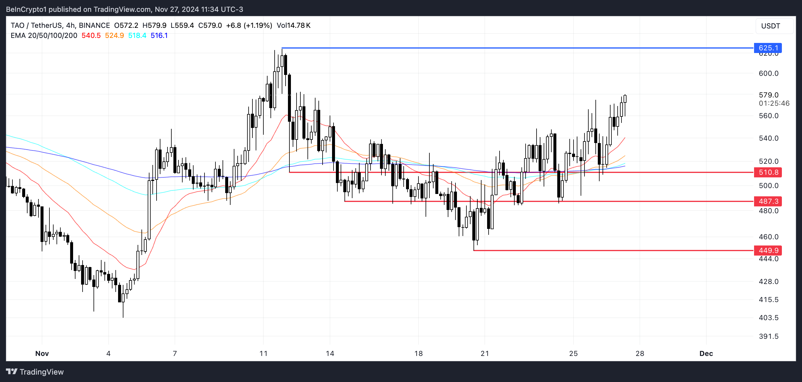ومع ذلك، إذا فقد الاتجاه الصعودي الحالي قوته، قد يواجه سعر TAO إعادة اختبار لمستويات الدعم الرئيسية عند $510 و$487. إذا فشلت هذه الدعوم، قد ينخفض السعر أكثر إلى $449، مما يشير إلى تصحيح كبير بنسبة 22%.