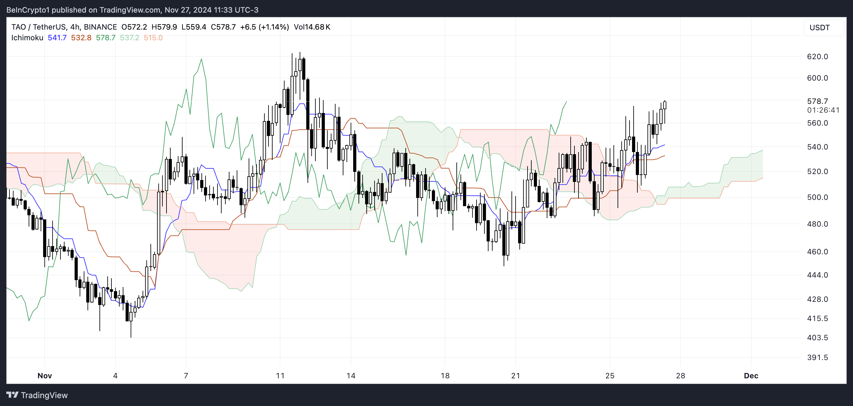 يظهر مخطط إيشيموكو كلاود لـ TAO اتجاهًا صعوديًا. يتم تداول السعر فوق السحابة (Senkou Span A وB)، مما يشير إلى زخم صعودي. كما أن خطي Tenkan-Sen (الخط الأزرق) وKijun-Sen (الخط البرتقالي) يقعان أيضًا تحت السعر، مما يدعم الشعور الصعودي.