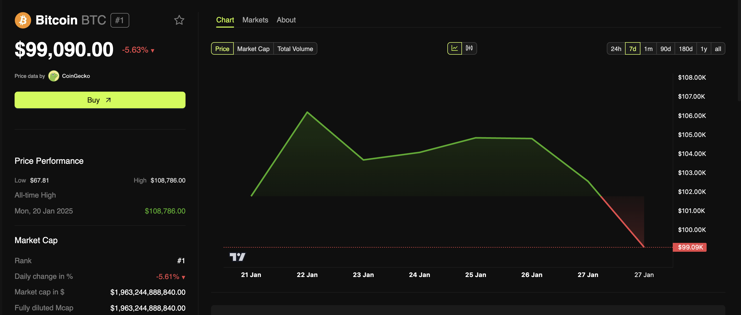 رغم التحركات الجريئة لشركة بلاك روك، بدأت بيتكوين الأسبوع بشكل صعب، مع انخفاض سعرها إلى ما دون علامة 100,000 دولار. في وقت كتابة هذا التقرير، كانت أكبر عملة مشفرة تتداول عند 99,090. وهذا يعكس انخفاضًا بنسبة 5,6% خلال الـ24 ساعة الماضية.