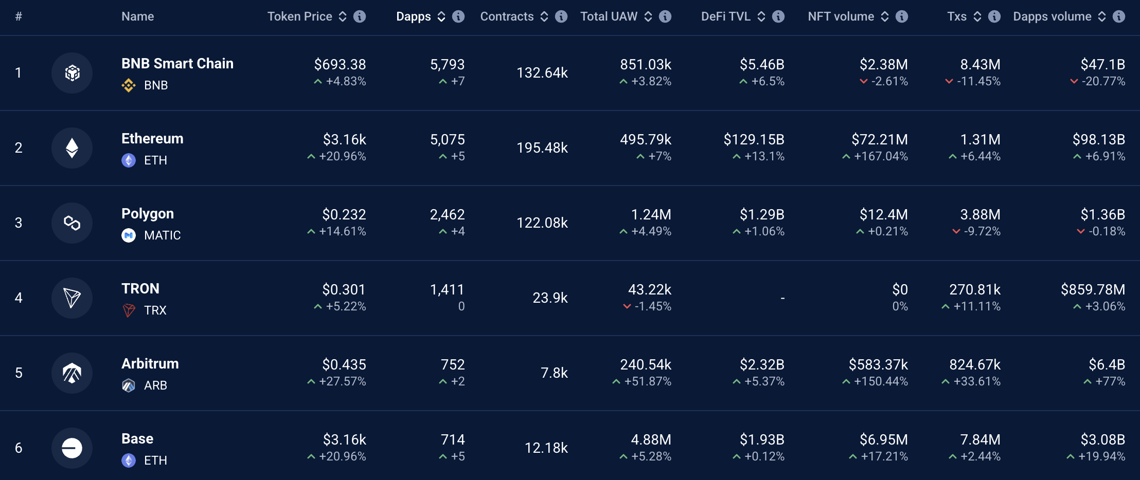 على الرغم من أنها تمثل فقط ١٨,٧٦% من إجمالي المعاملات، تحافظ BNB Chain على موقعها كشبكة تضم أكبر عدد من التطبيقات اللامركزية (Dapps). مع مجموعة واسعة من التطبيقات اللامركزية التي تغطي قطاعات مثل DeFi وGameFi وNFTs، تلعب BNB Chain دورًا حيويًا في الاحتفاظ بالمستخدمين والحفاظ على السيولة عبر نظامها البيئي.
