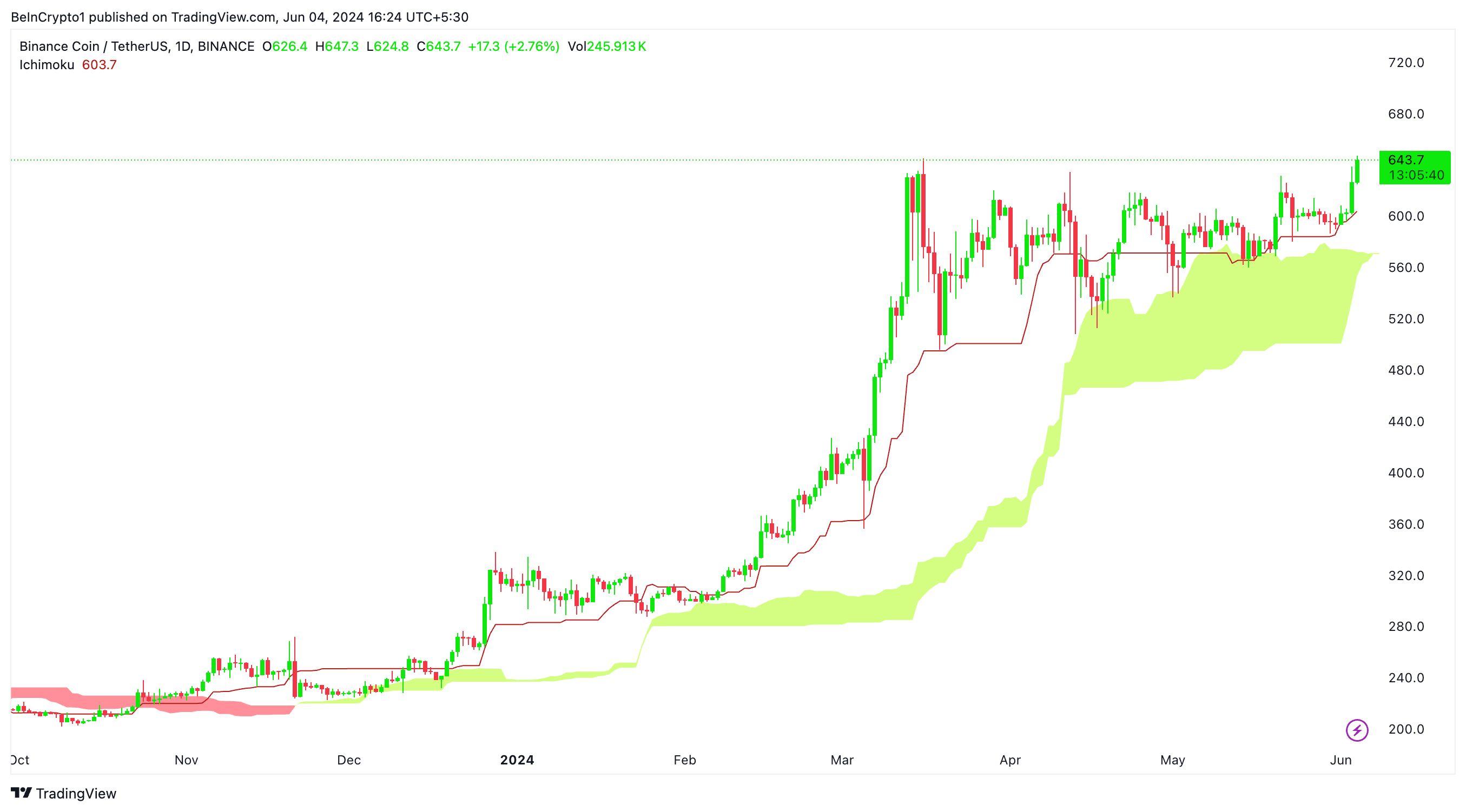 تشير مرونة BNB فوق السحابة إلى معنويات صعودية قوية، بينما يتم تعزيز الزخم الصعودي من خلال عدم قدرة البائعين على دفع السعر مرة أخرى إلى السحابة، مما يدل على انخفاض ضغط البيع. ويشير هذا الاستقرار فوق السحابة إلى أن المشترين يحتفظون بالسيطرة، مما يعزز التوقعات الصعودية ل BNB.