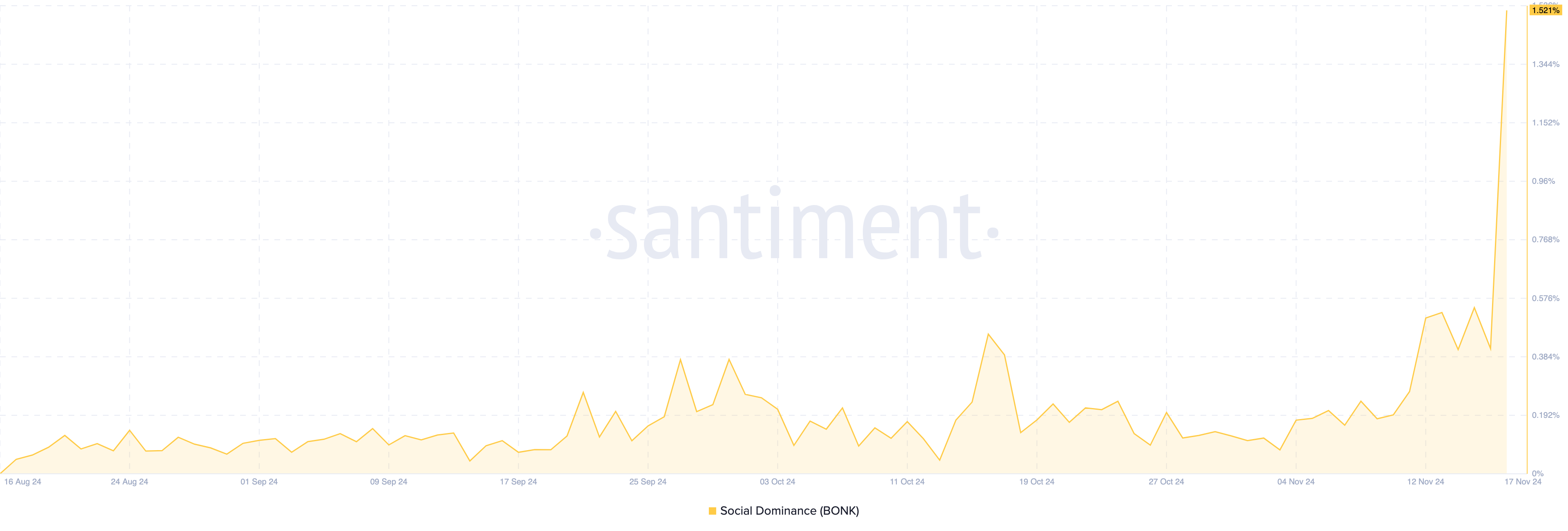 Sponsoredوسط هذا التطور، ارتفعت الهيمنة الاجتماعية لبونك إلى 1.52%. تقيس الهيمنة الاجتماعية مقدار الاهتمام الذي تحظى به عملة مشفرة مقارنة بالعملات الأخرى. يشير معدل عالٍ إلى وجود رؤية قوية للمجتمع، مما يعكس اهتمامًا وتفاعلًا متزايدًا داخل السوق.